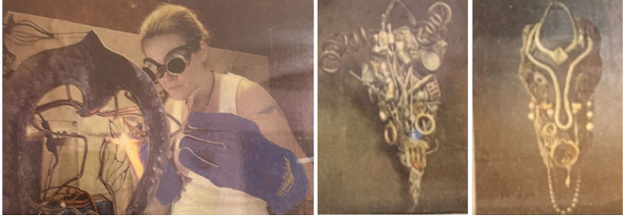 Courtney Gray is a metalsmith whose sculptures vary between small and wearable (jewelry) to large and mountable (wall hangings and masks). She makes jewelry through the ancient lost-wax process, in which she forms a design out of wax, makes a plaster cast of the wax, then slings molten metal into the cast using a centrifuge. It is meticulous, time-consuming and satisfying. But for her larger-scale sculptures, she gets to flex more muscle.